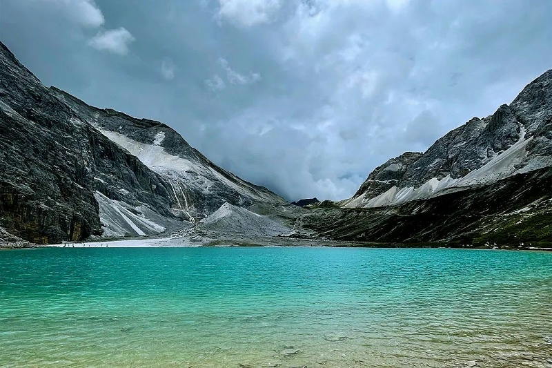 牛奶海海拔4500米,徒步起点的海拔是4150米,来回需要徒步10公里。“我们一行8人,只带了氧气瓶、葡萄糖水、小面包这些轻快又必须的东西。受高原反应的影响,即使已经轻装上阵,也感觉像是背了50多斤的重物前行。”