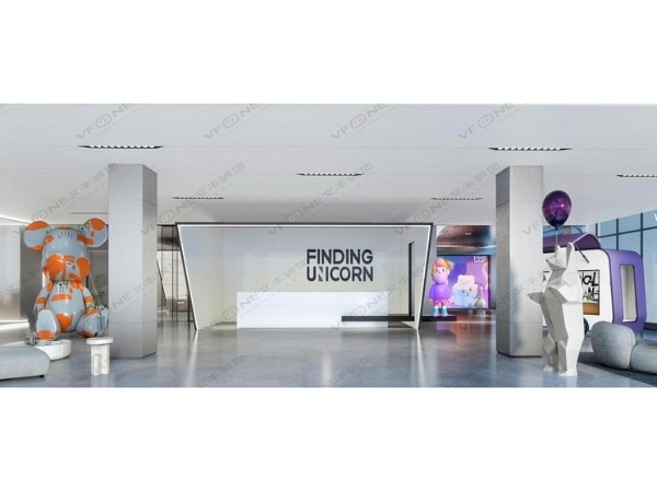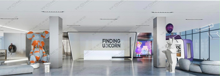空旷的前厅以及大面积的银白色,使人感受到办公环境应有的简约感。时尚的IP形象摆件凸显出公司前卫的审美,局部的高饱和色彩既不会破坏高级灰原有的质感,又能很好表现娱乐公司应有的活力。