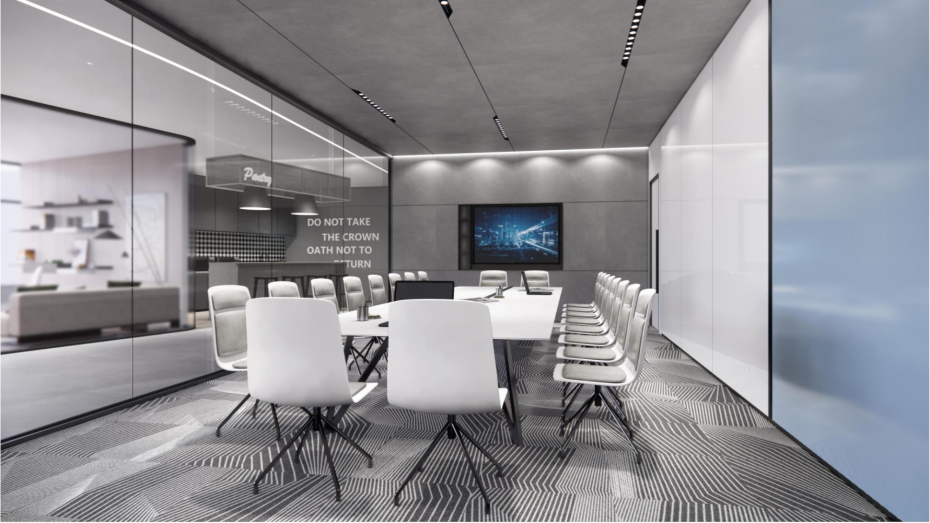 玻璃墙体在视觉上扩大了空间感,内侧雾霾蓝和纯白的拼接墙面增添了灵动性,避免了黑白灰色调在面积狭小的空间下显得过于局促单调。办公用具也遵循着简约的原则,极简的造型设计和干净的配色,始终提醒着参会人员注意时间与效率的概念。
