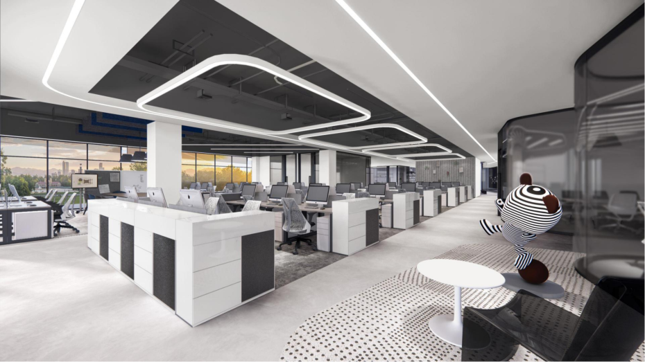 黑白色系构筑了专注干练的工作氛围,黑色波点地毯以轻松活泼的图案设计增强了视觉趣味性,白色线性灯管偏圆角矩形的线条更显简洁,更适合“少即是多”的设计表达。深圳装饰公司认为,这也正是现代年轻人更青睐的一种极简的态度。作为一个面向年轻群体的娱乐公司,更了解年青一代的心理,才更有助于提升服务项目的质感。