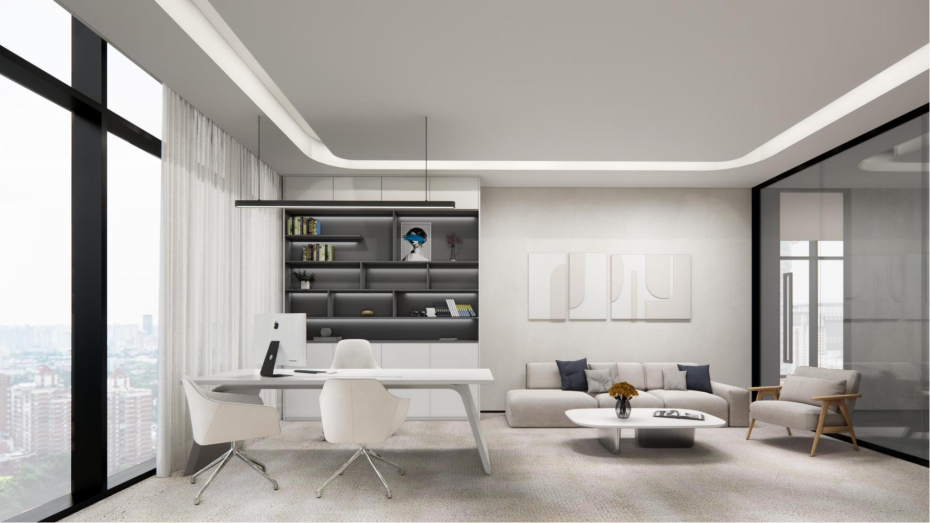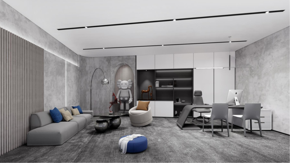 大理石的纹理质地与高级灰的环境色完美融合,局部低饱和的雾霾蓝和银白色家居饰品的点缀从细节处塑造着高贵典雅的层次感。同色系的IP立像表现了公司热衷于时尚潮玩的审美属性,欣赏潮玩艺术也是放松心情的不错选择。整个室内布置低调精致,又不失一位领导者应有的稳重格调。